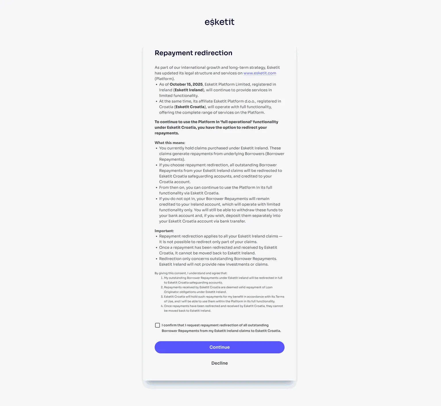 - Confirmer la redirection des futurs remboursements vers le compte Esketit Croatie.